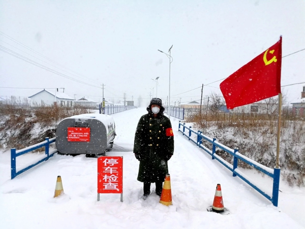 南山村村口飘扬的党旗下,卜林杰矗立在风雪中站岗。此时,他身上佩戴的党徽格外闪耀……作为一名党员,他始终践行着自己的初心,党旗在,阵地在,无怨无悔!