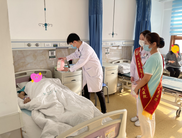 在儿科输液大厅,孩子们收到礼物后很开心,陪着输液的家长们也露出了笑容。随后,团员们还走访了神经内科、妇产科、五官科、消化内科病房,将节日的慰问品一一送至住院患者手上,鼓励他们积极治疗,祝福他们早日康复。