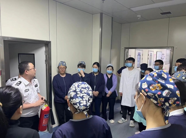 消防安全培训演练活动第一站在ICU开展。安全保卫科负责人以知识讲解结合实际操作的方式为ICU全体人员介绍了灭火器、消防栓的正确使用方法,并对如何报警以及发生火灾事故如何组织人员进行安全疏散等内容进行了讲解。随后,ICU现场模拟日常工作,以工作区域发生火灾为背景开展了演练。