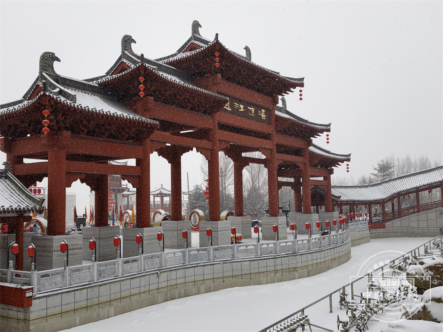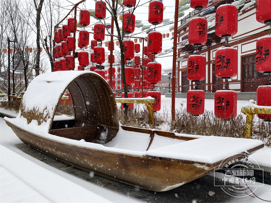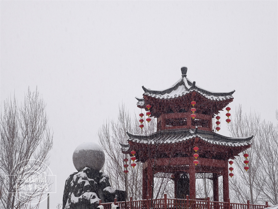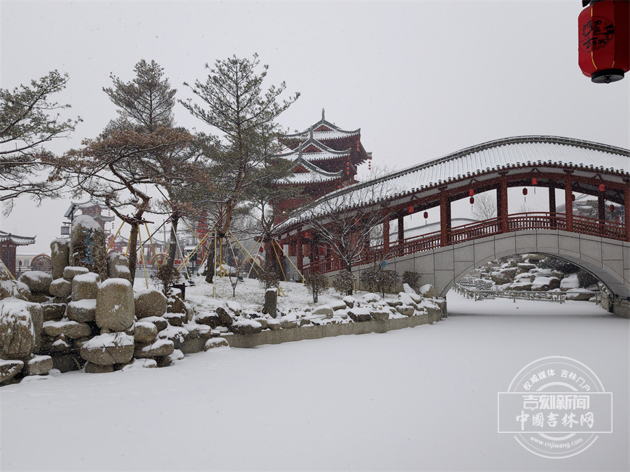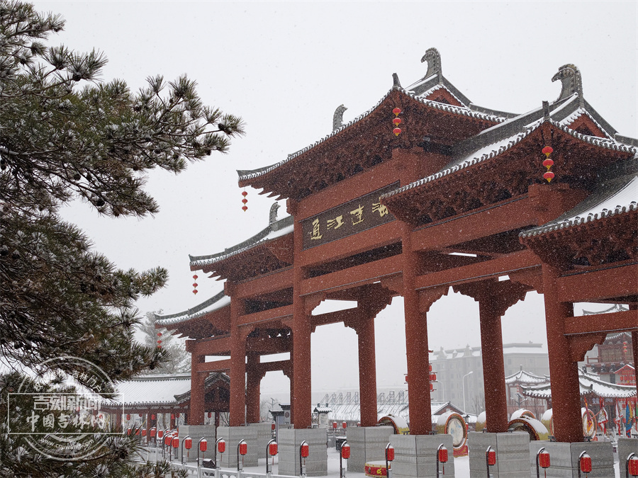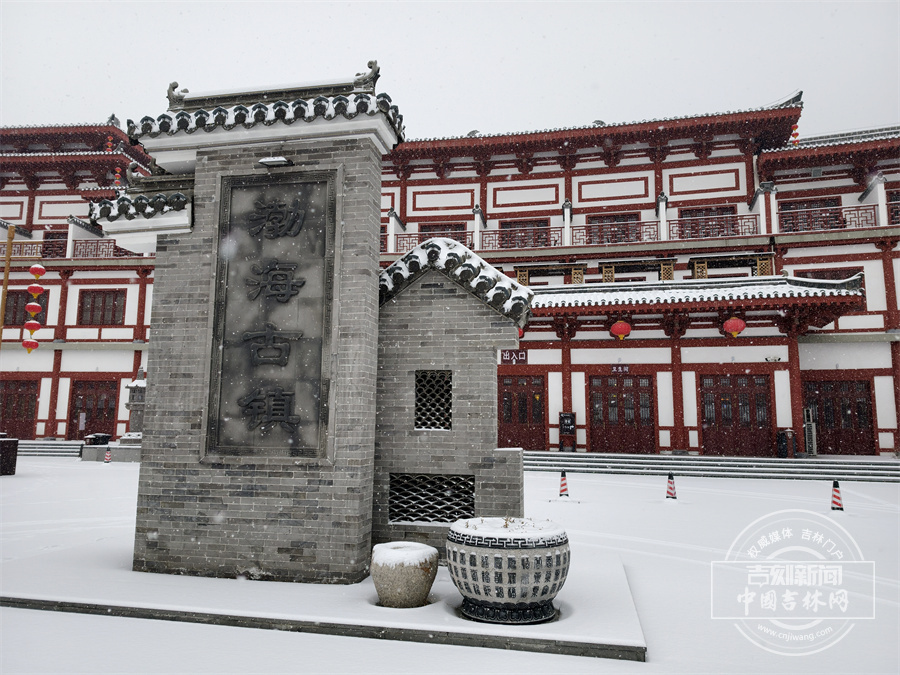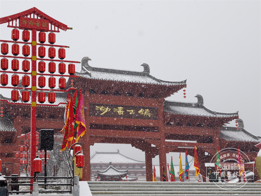 当雪花飘落,珲春渤海古镇散发出冬日限定的浪漫。唐式楼阁的飞檐斗拱覆上银霜,青石板路印满咯吱足音,红灯笼在白雪映衬下明艳动人,仿佛一幅徐徐展开的水墨画卷。