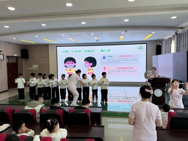 随后,医护人员带着孩子们练习七步洗手法,念诵朗朗上口的洗手口诀;耐心示范如何正确佩戴口罩:从遮盖口鼻到压紧鼻夹,每一个细节都反复叮嘱。在温柔的陪伴与引导下,孩子们渐渐建立起从容面对疾病的健康观念,学会自我守护的小本领。