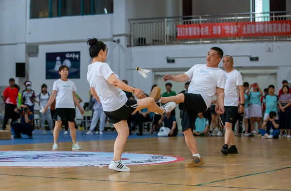 比赛分为混合三人赛,大白毽五人围踢比赛,大白毽、网毽混合踢比赛。其间,还进行了全民健身大白毽表演技能指导交流活动。