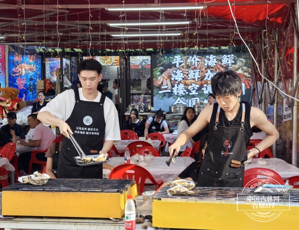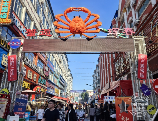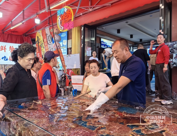 国庆假期,“蟹”逅珲春海鲜一条街人声鼎沸,在这条145米的街道上,近30家海产店沿街排开,暂养池里的帝王蟹挥舞蟹钳,鲜活的板蟹、毛蟹在水中游动,往来游客驻足挑选,热闹景象扑面而来。