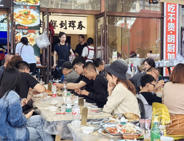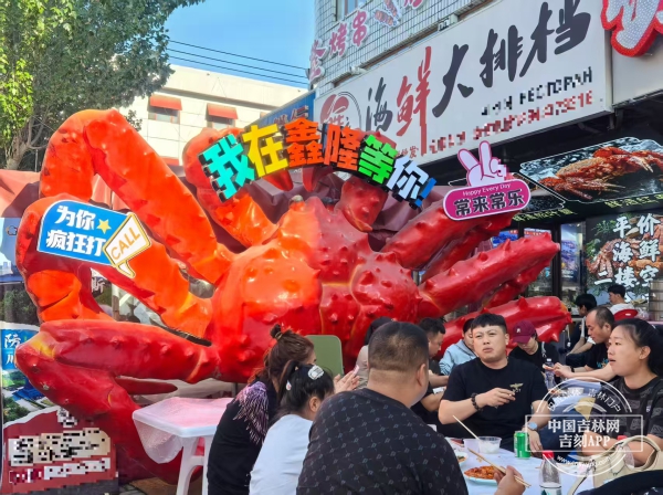 “我们到珲春了,吃到了帝王蟹,好多人呀,给你看看。”海产店门前的餐桌上坐满了来自全国各地的游客,一道道散发着香气的帝王蟹、板蟹等海鲜菜品令人垂涎,大家推杯问盏,享受着美食和假期带来的欢愉。