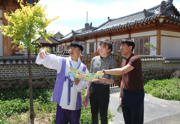 金雄(左一)向游客介绍旅游线路